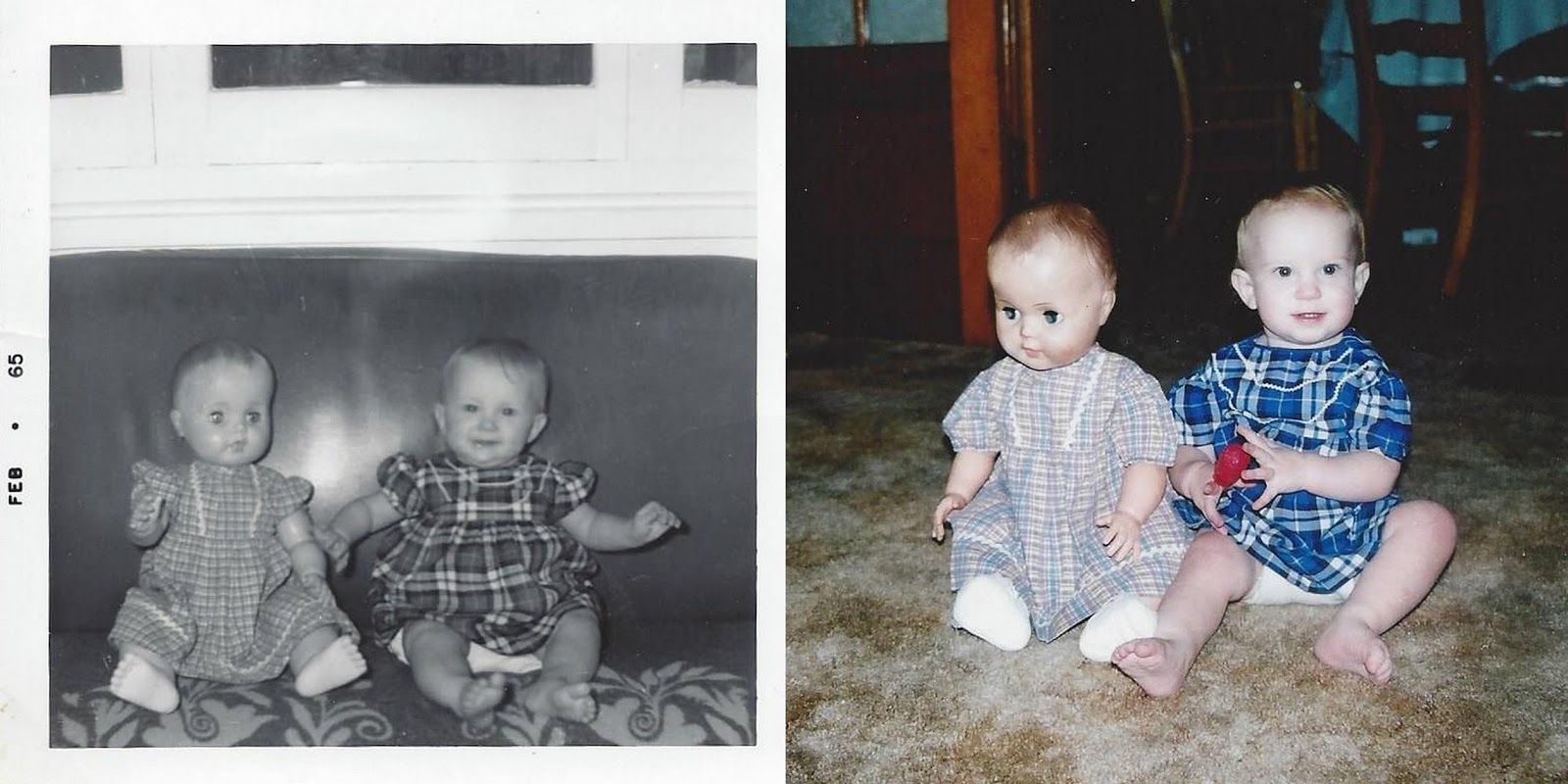 We recreated the photo that Aunt Barb took of me in the doll's dress.